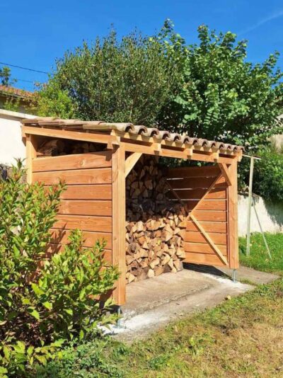 Abri à bûches en bois avec panneaux latéraux ventilés.