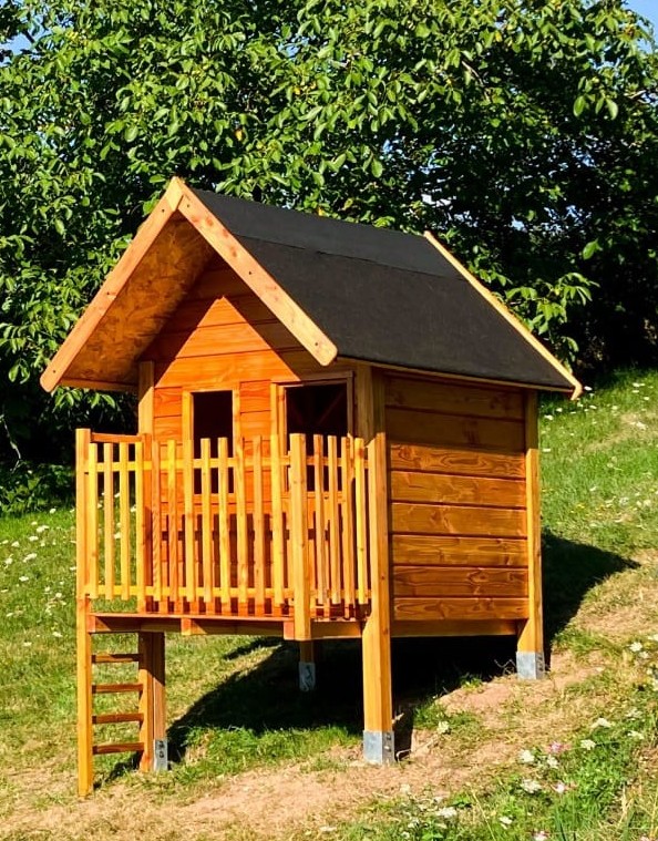 Cabane pour enfants sur pilotis en bois épaisseur 21mm avec plancher et portillon.